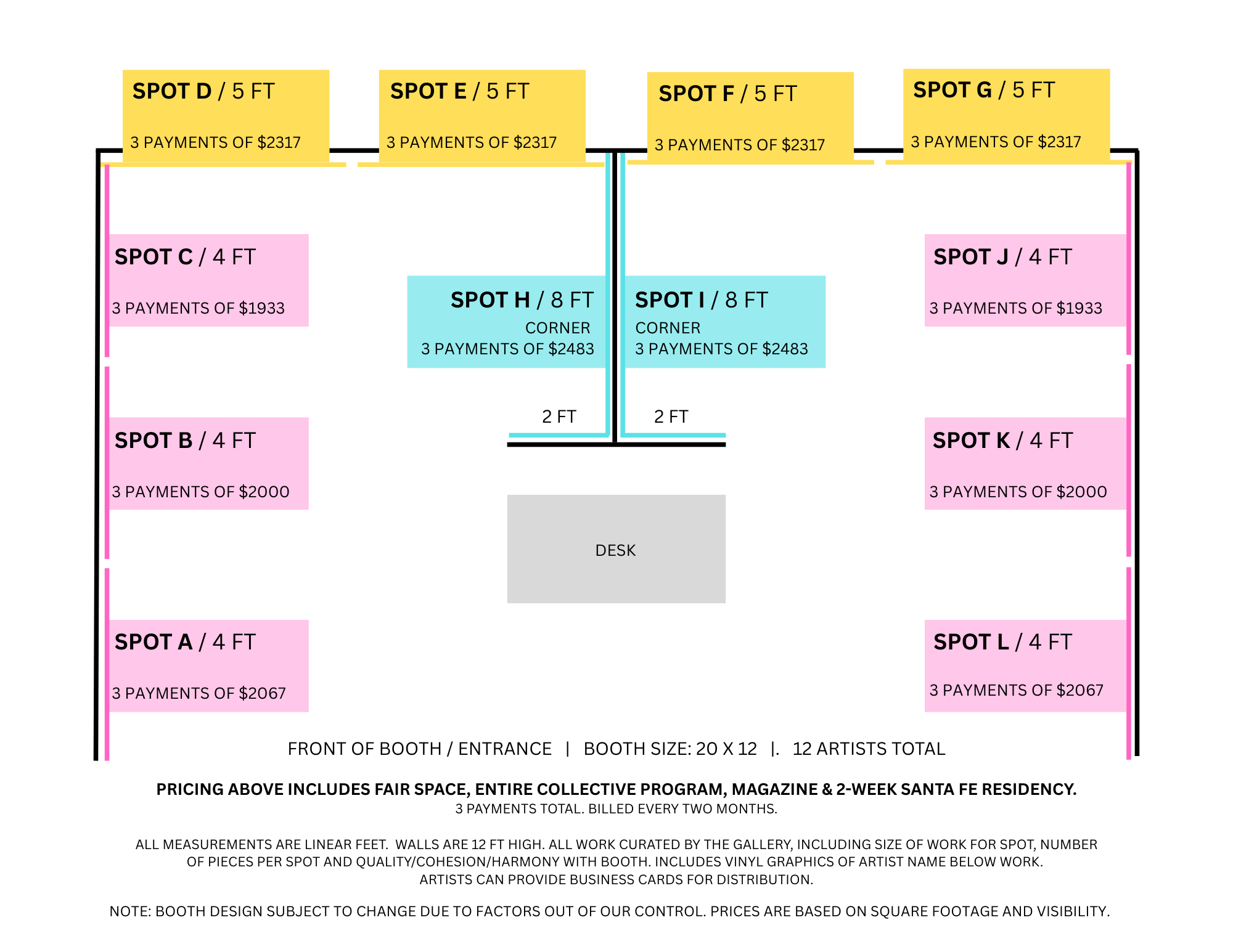 Artists select their space in the booth (below) and prices for the collective are based on spot selected (see below booth map, bottom of page)