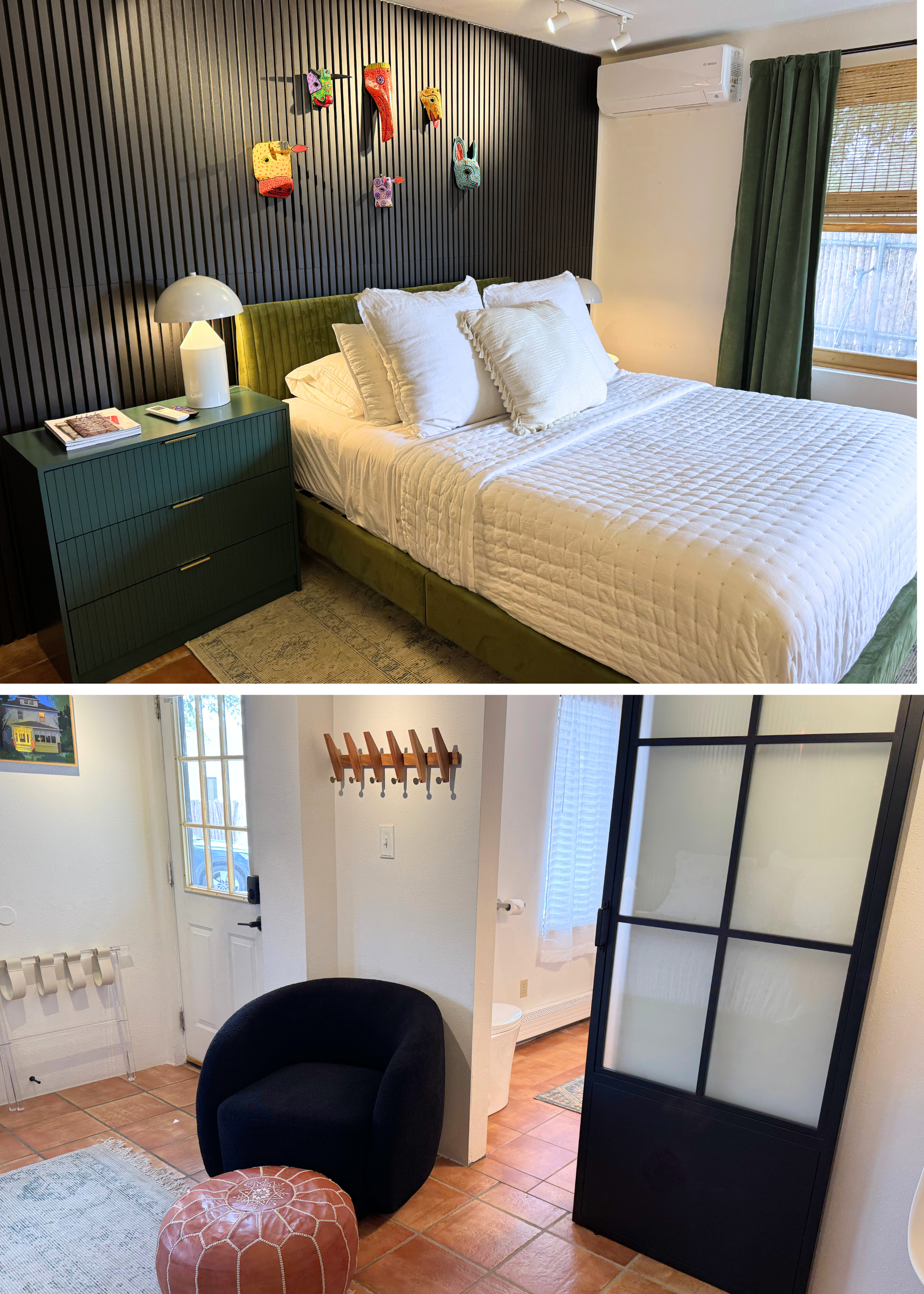Our folk-art inspired room with a bohemian feel and soaking tub w/ shower combo in the ensuite bath, Sunflower has a private entrance, kitchenette and peaceful, creative vibes galore.